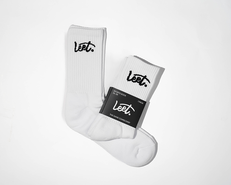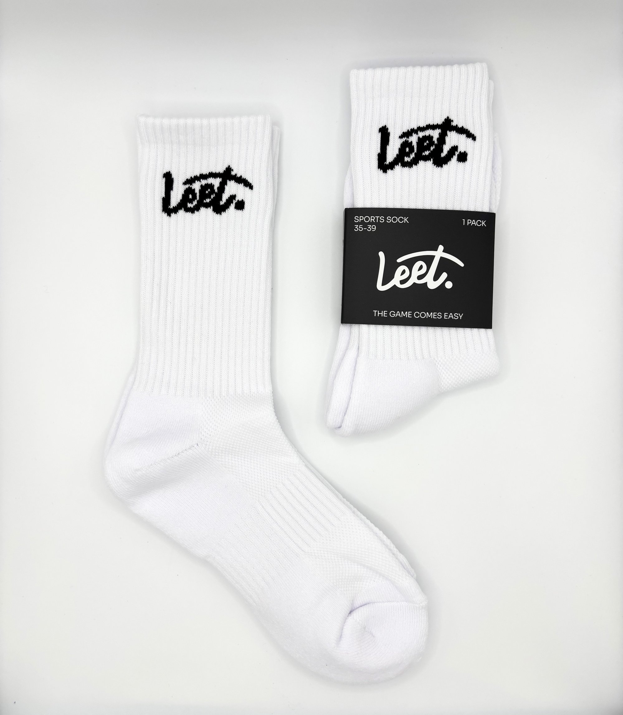 Keep your game looking elite at all times with the all white sports crew sock sporting the classic Leet. logo in black.