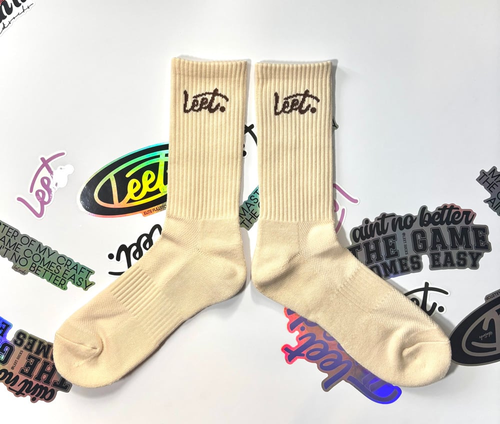 Walk the earth, stay grounded, be humble, Leet. has you covered with these sandy brown sports crew socks sporting the classic Leet. logo in brown.